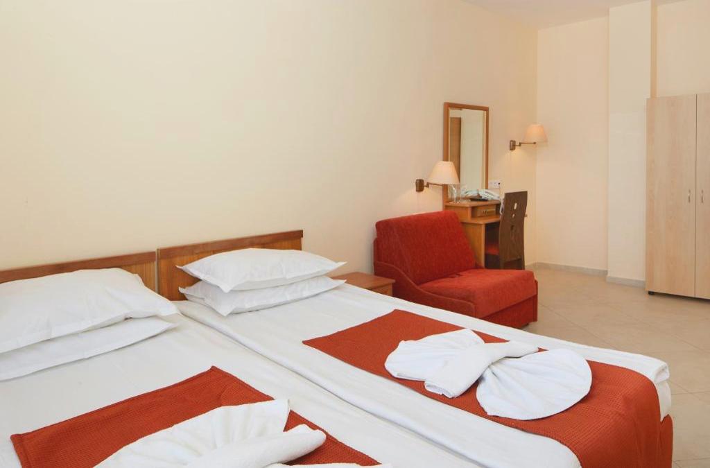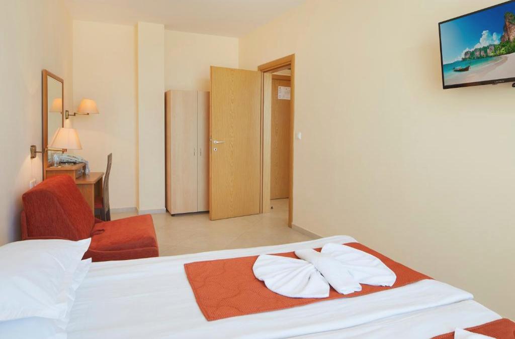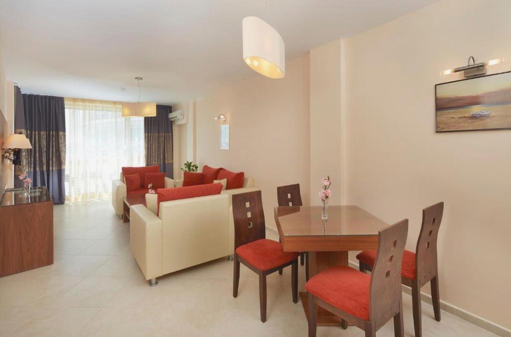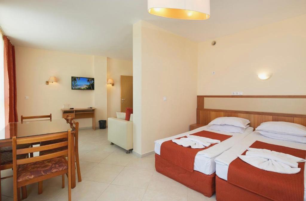 Dieses Strandhotel genießt eine erstklassige Lage direkt im Zentrum des Sonnenstrand-Resorts, nur etwa 50 m vom Sandstrand entfernt. Direkt vor der Haustür des Hotels finden die Gäste Schnäppchen, Restaurants, Bars, Nachtclubs und Anbindungen an das öffentliche Verkehrsnetz, während der Busbahnhof zu Fuß in etwa 10 min zu erreichen ist. Nesebar und seine Altstadt sind etwa 4 km von diesem Clubresort entfernt, und die Stadt Burgas ist etwa 40 km entfernt. Der Flughafen Burgas ist etwa 35 km und der Flughafen Varna etwa 120 km entfernt. Das Hotel wurde vor kurzem im Jahr 2009 eröffnet. Es ist ein modernes Designhotel mit 5 Etagen, einer Gesamtkapazität von 56 Zimmern und einer perfekten Lage mit Blick auf das Meer, nur durch einen Spaziergang davon getrennt. Das Hotel ist ein klimatisiertes Haus mit Empfangshalle mit 24h-Rezeption und Check-out-Service, Hotelsafe, Wechselstube, Garderobe und Aufzug sowie Spielzimmer, Cafeteria, Bar und Restaurant.. Außerdem können die Gäste den WLAN-Internetzugang oder den Zimmer- und Wäscheservice (letzteres gegen Gebühr) sowie den Parkplatz nutzen. Die Suite Zimmer sind modern eingerichtet und komplett ausgestattet mit einem Badezimmerezimmer mit Dusche und Haartrockner sowie mit Sat.-TV, einem Direktwahltelefon, einem kleinen Kühlschrank, einem Doppelbett, einer individuell regulierbaren Klimaanlage und einem privaten Balkon. Zu den Sport- und Freizeitaktivitäten des Hotels zählen ein Außenpool mit Pool-/Snackbar (gegen Gebühr) und eine Terrasse mit Liegestühlen und Sonnenschirmen (gegen Gebühr). Am Strand können Sie gegen Gebühr einer Vielzahl von Wassersportarten nachgehen, darunter Bananenbootfahren, Wasserski und Tretbootfahren. Am nahen Sandstrand können Liegestühle und Sonnenschirme gemietet werden.