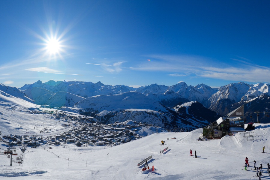 Alpe d'Huez, auch bekannt als "Insel der Sonne", ist eines der sonnigsten Skigebiete der französischen Alpen und liegt im Massiv der Grandes Rousses. Dieses Skigebiet bietet eine große Vielfalt an Pisten für alle Schwierigkeitsgrade und einen atemberaubenden Blick auf das Tal der Romanche und die umliegenden Gipfel. Das Skigebiet liegt auf einer Höhe von 1.860 Metern und bietet 250 km Pisten und die berühmte 16 km lange schwarze Piste Sarenne, eine der längsten der Welt. Alpe d'Huez ist ein hervorragendes Ziel für alle, die einen ganzen Tag lang Skifahren wollen, aber auch für diejenigen, die alternative Aktivitäten und eine lebendige Umgebung suchen.