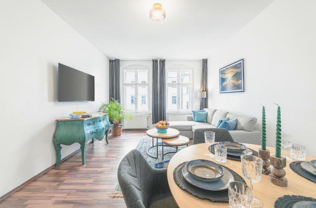 This spacious and luxurious apartment is situated in the Mitte district in the heart of Berlin. The Rheinsberger Mitte, 80m2, 2BR & Living Room, downtown location, Sleeps 6 offers free WiFi. The accommodation comes with 2 bedrooms as well as a living room with pull-out sofa, a dining table and a flat-screen TV. Towels and bed linen are provided in this self-catering accommodation. The Rheinsberger Mitte, 80m2, 2BR & Living Room, downtown location, Sleeps 6 is just 2 short underground stops on the U8 underground line from the Hackescher Markt shopping street and Alexanderplatz with the iconic TV Tower. This can also be reached in just 5 minutes by tram. Tegel Airport is 7 km from the accommodation.