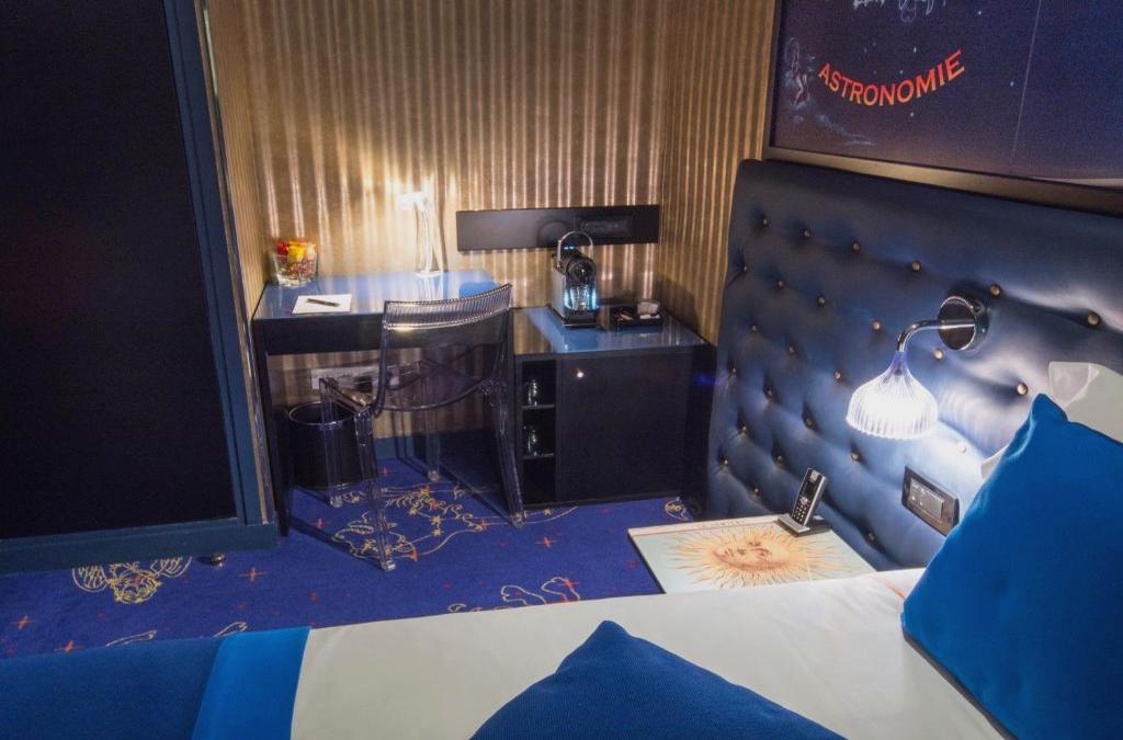 The hotel located at 38, rue Cardinet, in the elegant 17th arrondissement of Paris, very close to the Monceau park and the most beautiful tourist places of the French capital, is a true invitation to dream. Illusion, dreamlike, feral. Enter the universe of magic. Live a unique experience with the five themes staged in the rooms. Card game: playing cards flying in a flash of colors. Illusion: the birth of a fantasy atmosphere. Levitation: the body floats in the hands of the magician. Celestial magic: seduced by the mysteries. A space dedicated to palmistry and the signs of the zoodiac. Méliés: live the first steps on the moon through a tribute to the filmmaker and magician Méliès and his short film; special effects guaranteed. It is 12 minutes from Arc de Triomphe and 3 minutes from Parc Monceau.