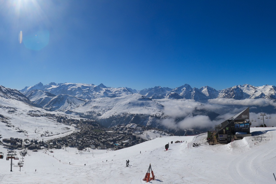 Known as the "Island of the Sun", Alpe d'Huez is one of the sunniest ski resorts in the French Alps, located in the Grandes Rousses massif. This ski resort boasts an extensive variety of slopes for all levels and breathtaking views of the Romanche valley and surrounding peaks. The resort, located at an altitude of 1,860 metres, offers 250 km of slopes and the famous 16 km long Sarenne black run, one of the longest in the world. Alpe d'Huez is an excellent destination for those who want a full day of skiing as well as for those looking for alternative activities and a vibrant environment.