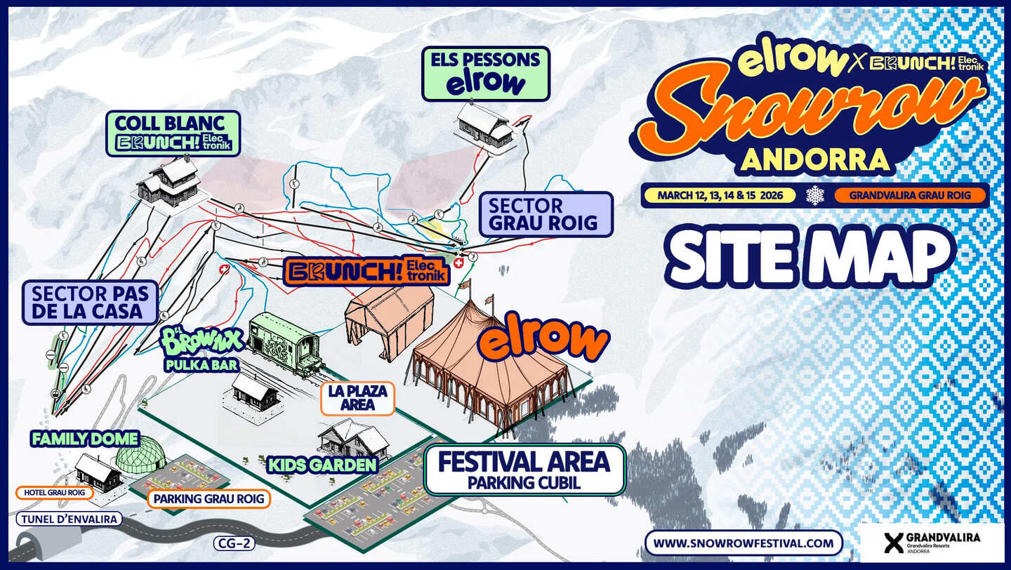 Pendant le Snowrow Festival, vous trouverez des soirées secrètes, des sessions après-ski avec des DJ et des artistes nationaux et internationaux. Chaque jour du festival commencera à 11h00 avec des spectacles immersifs, des activations, des pop-ups, des jeux, des concours, du théâtre de rue, des zones pour les enfants et les jeunes, et des espaces conçus pour le plaisir des familles. Pour le public plus adulte, le grand événement Elrow & Brunch aura une enceinte pouvant accueillir jusqu'à 8 000 personnes et des heures d'ouverture de 16h00 à 00h00 . Vous pouvez consulter le plan de la scène ici.