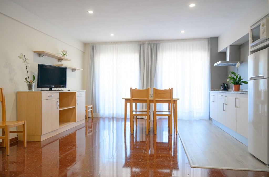 • Apartamento de dos dormitorios: con capacidad hasta 6 personas. Se compone de dos dormitorios con 2 camas individuales cada uno, salón-comedor con sofá cama para otras 2 personas, equipamiento funcional para tu estancia, televisión, mesas y sillas, y cocina independiente totalmente equipada. También cuenta con balcón, y conexión wifi gratuita en todos los apartamentos.