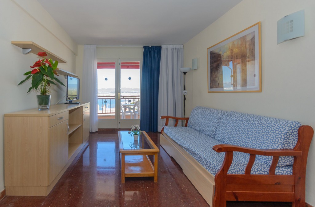 • Apartamento de dos dormitorios con vistas: con capacidad hasta 6 personas. Se compone de dos dormitorios con 2 camas individuales cada uno, salón-comedor con sofá cama para otras 2 personas, equipamiento funcional para tu estancia, televisión, mesas y sillas, y cocina independiente totalmente equipada. También cuenta con balcón, y conexión wifi gratuita en todos los apartamentos.