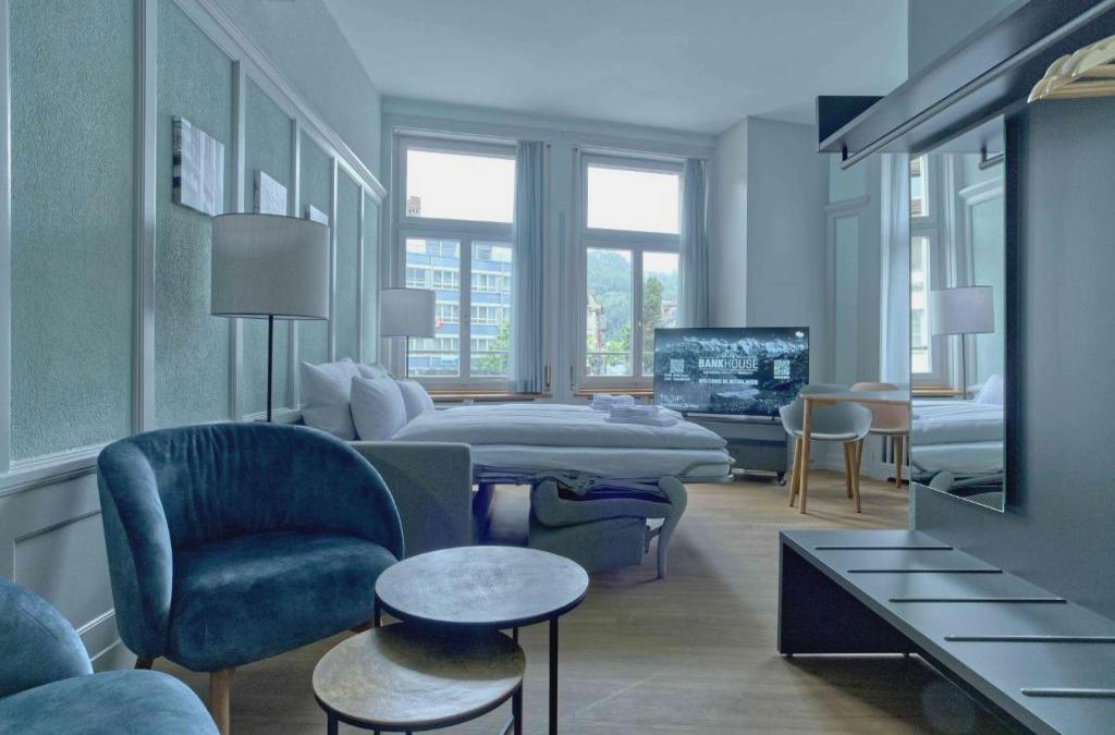 BANK House Apartment XL 105 - GRIWA RENT está en el centro de Interlaken, a solo 19 km de Grindelwald Terminal y a 22 km de Catarata del Giessbach, y ofrece alojamiento con vistas a la ciudad y wifi gratis. El apartamento está en una zona en la que se pueden practicar actividades como senderismo, esquí y ciclismo. Este apartamento con aire acondicionado consta de 1 dormitorio, una sala de estar, una cocina totalmente equipada con nevera y cafetera, y 1 baño con ducha y secador de pelo. Hay toallas y ropa de cama en el apartamento. El aeropuerto (Aeropuerto de Berna-Belp) está a 50 km, y el alojamiento ofrece servicio de traslado de pago para ir o volver del aeropuerto.