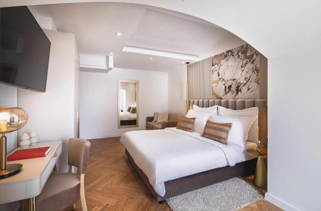 The UNESCO-listed Euphrasian Basilica is just 200 metres away. Set in the historic building right on the vivid seaside promenade, Boutique Hotel Mauro offers elegantly decorated rooms overlooking the Adriatic Sea or Poreč historic core. Free WiFi is provided. These modern-style rooms are decorated with stone and wooden elements. Each room is air-conditioned and amenities include a flat-screen TV, minibar and a safe. Private bathroom comprises a bath tub, a hairdryer and free toiletries. Some rooms have a private balcony with sea views. The beach are only a 5-minute boat ride away and features baldachins, loungers and parasols, available at a surcharge. The Blue Flag awarded beach with its pristine and clear sea is 400 m away. Please note that the beach are located on the St. Nicholas Island, across the hotel, just a few minute boat ride away, free boat/shuttle service is provided. For a breakfast you can enjoy on the terrace with sea view, or in the lobby area,. A selection of freshly prepared meals, including egg dishes, prosciutto and cheese, fruits, cakes, as well as a espresso coffee, sparkling wine are included in the rich breakfast buffet. The surrounding area features picturesque cycling trails. Historic St. Nicholas Island is located across the bay, just a few minute boat ride away. Main Bus Station at a distance of 600 metres. Pula Airport is located 50 km from the property. For guests staying at Boutique Hotel Mauro the parking is ensured in the Žatika parking ( street: Karla Huguesa 26, Poreč 52440 ) From there, free transfer is organised to the hotel and back (directions to the hotel on this page lead to this parking area - hotel position on the map is parkings location). For more info, please contact the reservations centre: +385 52 219-500 GPS coordinates of the parking lot (click here): latitude: 45° 13’ 27.45’’ N (45.221513888888886N) longitude: 13° 36’ 27.42’’ E (13.607616666666667E)