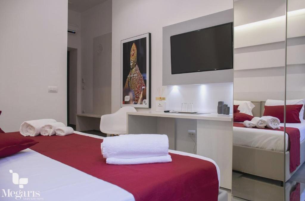 Megaris Luxury Suite Rooms dispone de vistas a la ciudad, bar y wifi gratis. Ofrece alojamiento con una ubicación ideal en Nápoles, a poca distancia de Castel Nuovo, Palacio Real de Nápoles y Teatro de San Carlos. Cada unidad tiene baño privado, bidet, aire acondicionado, TV de pantalla plana y nevera. En el alojamiento se puede disfrutar de un desayuno a la carta, italiano o sin gluten. En el bed and breakfast, la clientela puede disfrutar de bañera de hidromasaje. Megaris Luxury Suite Rooms ofrece servicio de alquiler de coches. Cerca del alojamiento hay puntos de interés como Museo Arqueológico Nacional, Molo Beverello y Plaza del Plebiscito. El aeropuerto (Aeropuerto internacional de Nápoles) está a 9 km, y el alojamiento ofrece servicio de traslado de pago para ir o volver del aeropuerto.