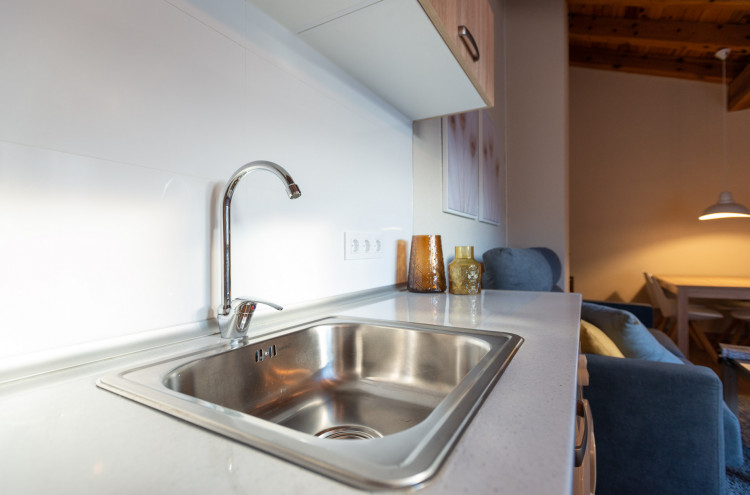 Alojamento com cozinha, forno, microondas e torradeira.