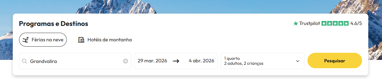 Selecione o número de pessoas com quem vai viajar com um mínimo de 4 ou mais dias de forfait em Grandvalira, Pal-Arinsal e Ordino Arcalís.De seguida, escolha a idade das crianças e clique no botão "Procurar" para iniciar o processo de reserva.
