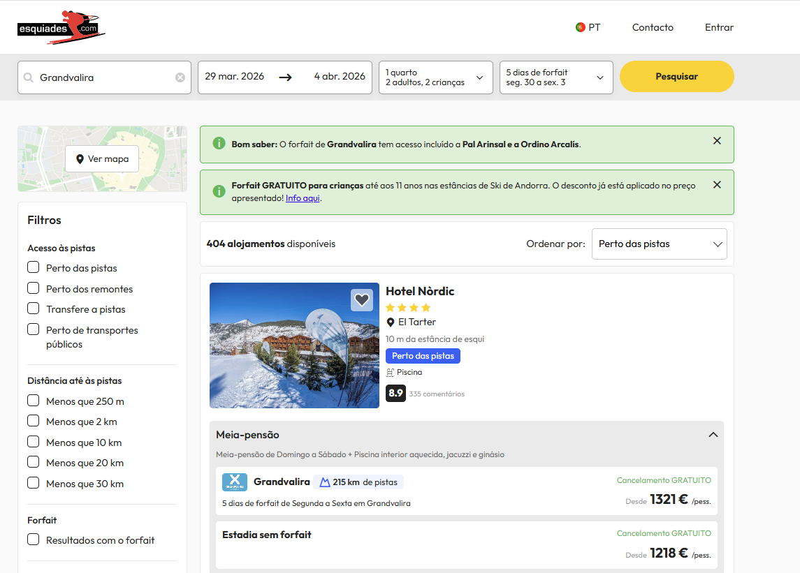 Depois de ter escolhido as datas em que vai viajar, pode escolher um dos muitos hotéis em Andorra disponíveis no nosso site e verificar a sua distância das diferentes estâncias de Grandvalira. Esta super promoção está disponível para esquiar em: